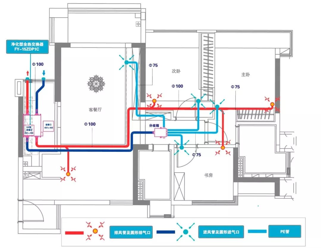 送風(fēng)噪音小,各風(fēng)管風(fēng)量均衡。PE管道施工,管道中間無接口,施工便捷。